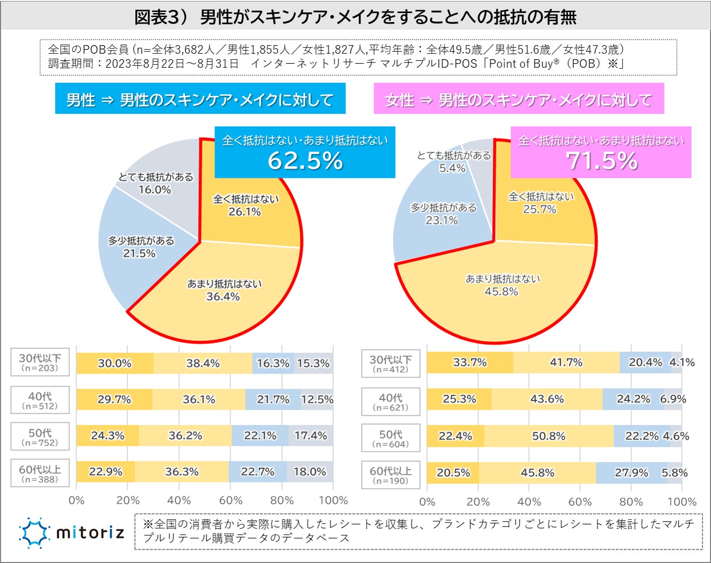 また、男性は世代が上がるに連れ「抵抗はない」の比率が下がっているのに対し、女性は40代で一度下がった後、50代で改めて上がっているのが特徴的です。40代から50代になり女性は男性の美容に肯定的な人が増える一方で、男性は肯定的な人が減っており、男女間の差が12.7Pで世代別で最も開きが出ています。50代は男性の美容に対する考え方に対して男女間で最も隔たりがある世代と言えそうです(図表3)。