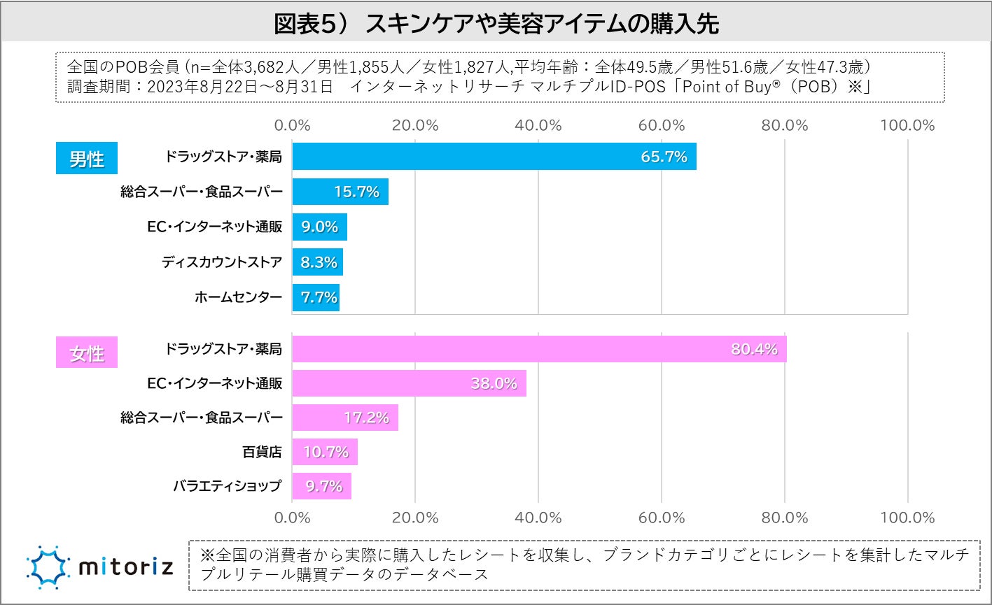スキンケア・美容アイテムを購入する場所を尋ねたところ、男女ともに「ドラッグストア・薬局(男性65.7%/女性80.4%)」が最も利用されている結果となりました。女性は2位に「EC・インターネット通販(38.0%)」が入っているのに対して、男性は女性の4分の1程度の9.0%とネット購入がかなり少ないことがわかります。また、男性の上位に入っている「ディスカウントストア」や「ホームセンター」は女性の上位には入らず、代わりに「百貨店」や「バラエティショップ」が入っているのも特徴的です(図表5)。