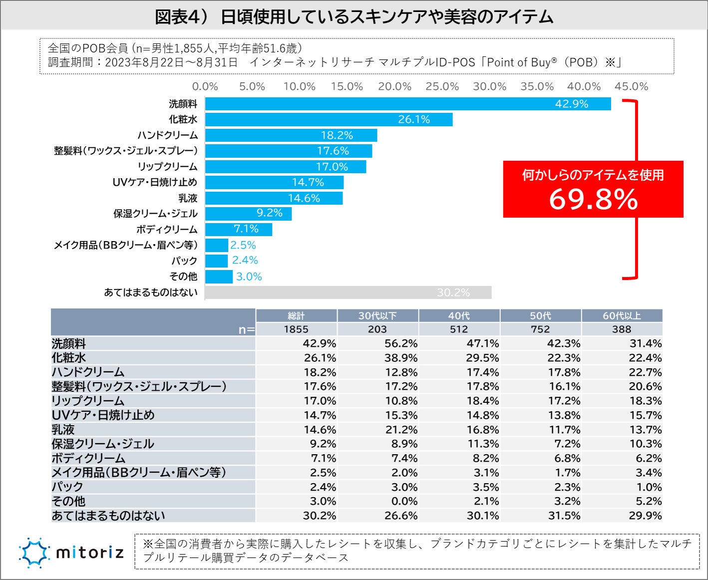 男性会員に日頃使用しているスキンケアや美容アイテムを複数回答式で尋ねたところ、69.8%の人が何かしらのアイテムを使用している結果となりました。使用率の高い上位3つは「洗顔料(4.28%)」「化粧水(26.1%)」「ハンドクリーム(18.2%)」で洗顔料と化粧水は若い世代ほど使用率が高く、世代が上がるに連れて資料率が下がる一方、ハンドクリームは世代が上がるに連れ使用率が高くなっています(図表4)。