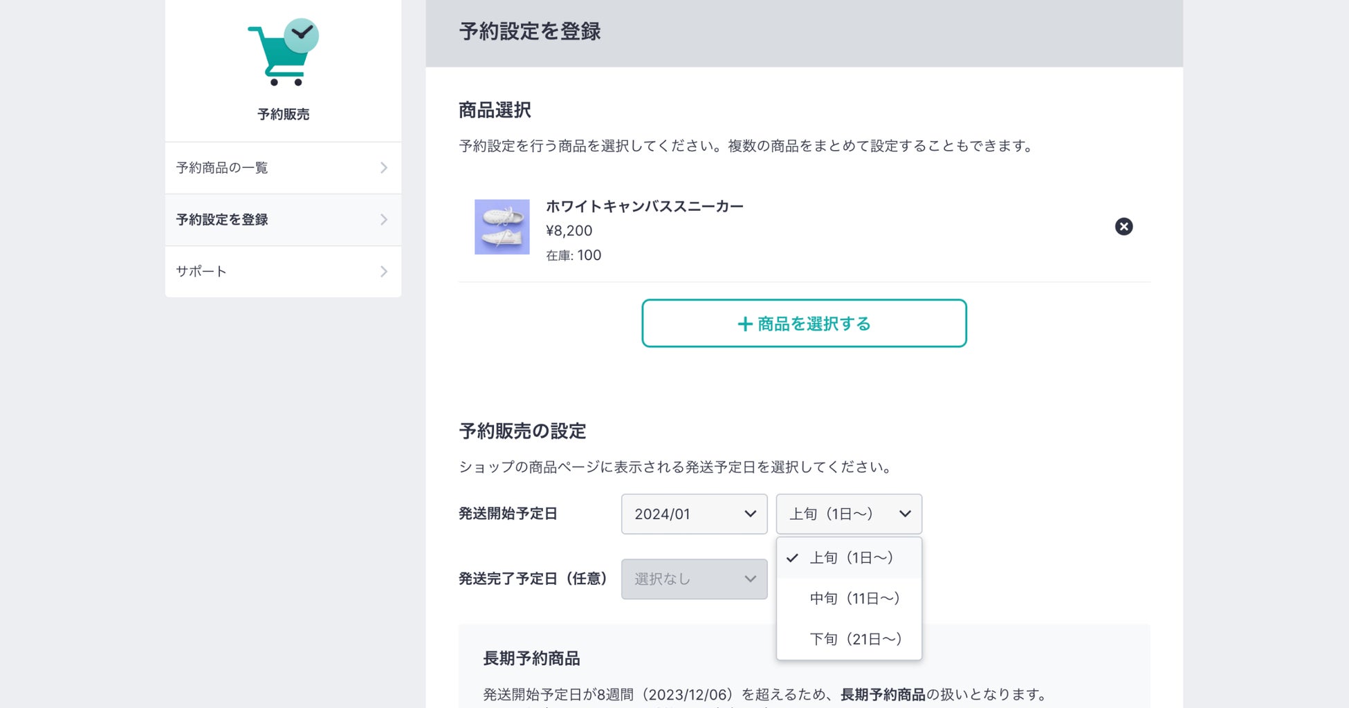 1、「予約販売 App」の設定で、長期予約販売をしたい商品を選択