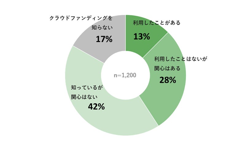 クラウドファンディングを「利用したことがある」が13%、「利用したことはないが、関心はある」が28%となり、合わせると41%が関心を持っている。「クラウドファンディングを知らない」を除くと、認知率は8割を超えた。