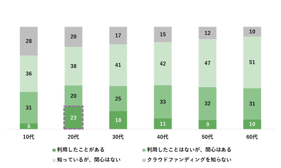 クラウドファンディングへの関心は全体で41%。利用率は20代がトップ