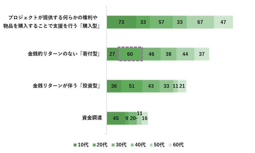 また、実際に利用したことがあるクラウドファンディングの種類を聴取したところ、20代では「寄付型」(60%)がトップだった。寄付型の利用経験についても、20代は他の年代と比較して高いことが確認された。