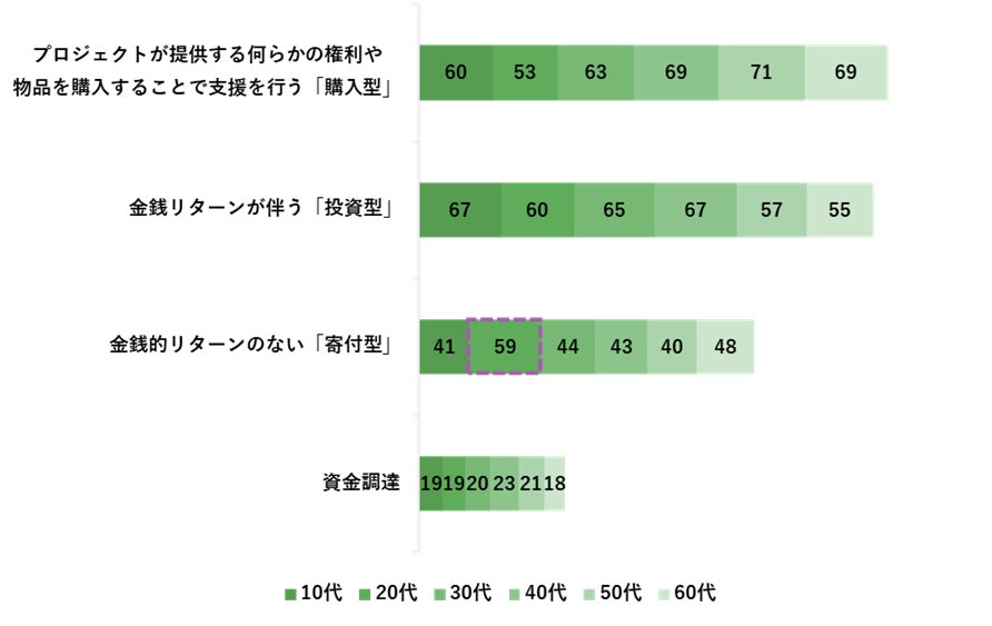 関心のあるクラウドファンディングの種類は、全体では1位「購入型」、2位「投資型」だった。20代においては「寄付型」への関心が59%となり、寄付意識が他の年代と比較して高い。