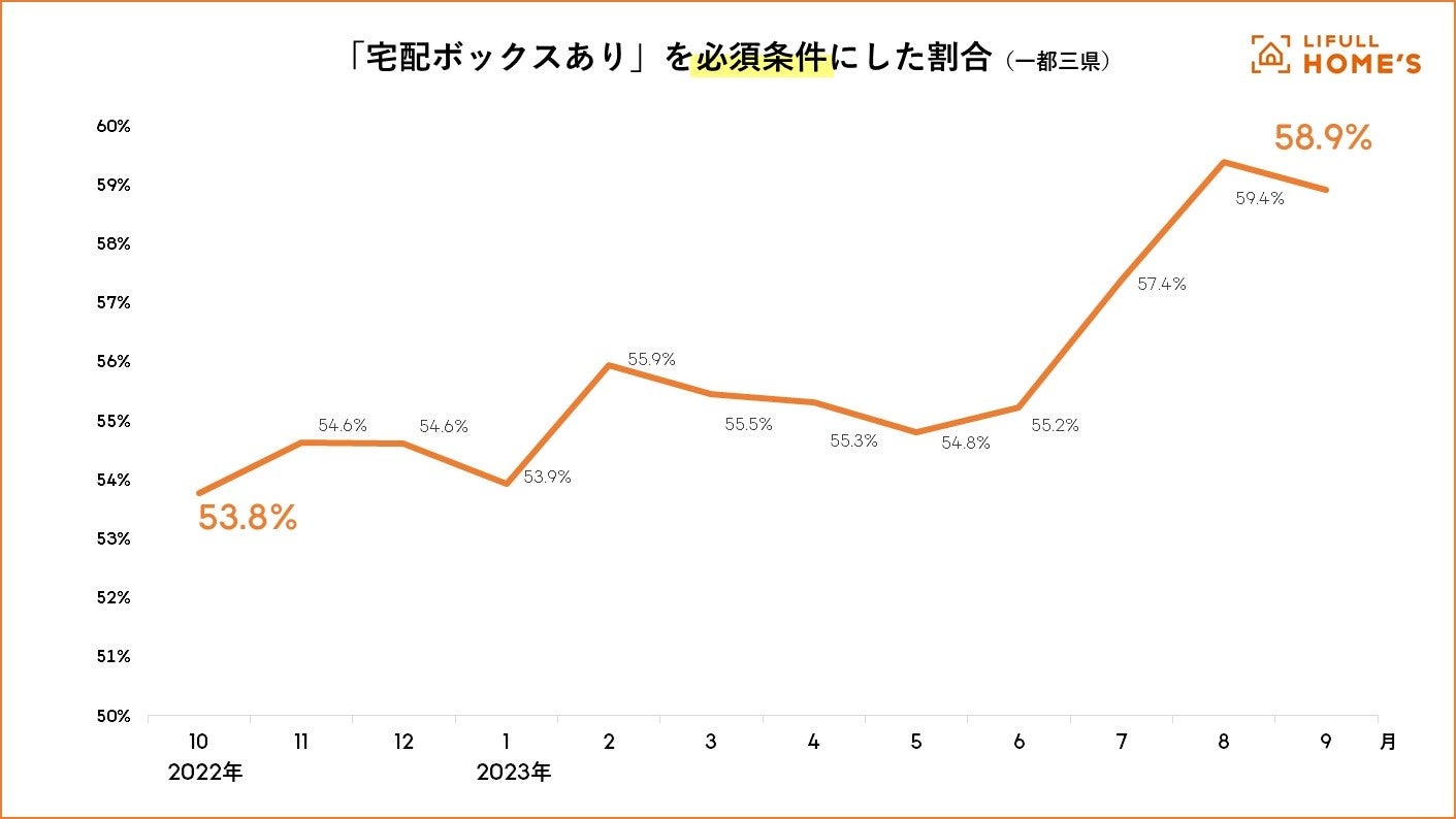 LIFULL HOME'Sでは物件探しの検索条件を「できれば/必須」で優先順位づけをして検索できる『できれば検索』という機能を搭載しています。そこで、物件を探す際に、「宅配ボックスあり」が「必須」選択された割合を調査したところ、2023年6月以降伸びが大きく、直近では6割近くが「必須」選択をしていることがわかりました。