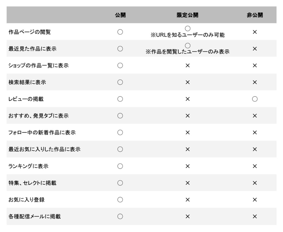 『限定公開』では、URLを知るユーザーのみ作品ページを閲覧できるほか、作品を閲覧したユーザーのページにのみ「最近見た作品」として作品が表示されます。また、『限定公開』の作品においても、購入者はレビューを投稿することができます。ただし、投稿されたレビューは、ショップや作品詳細のレビュー欄に掲載されません(限定公開作品と公開作品を同じカートに入れて購入した場合も同様です)。