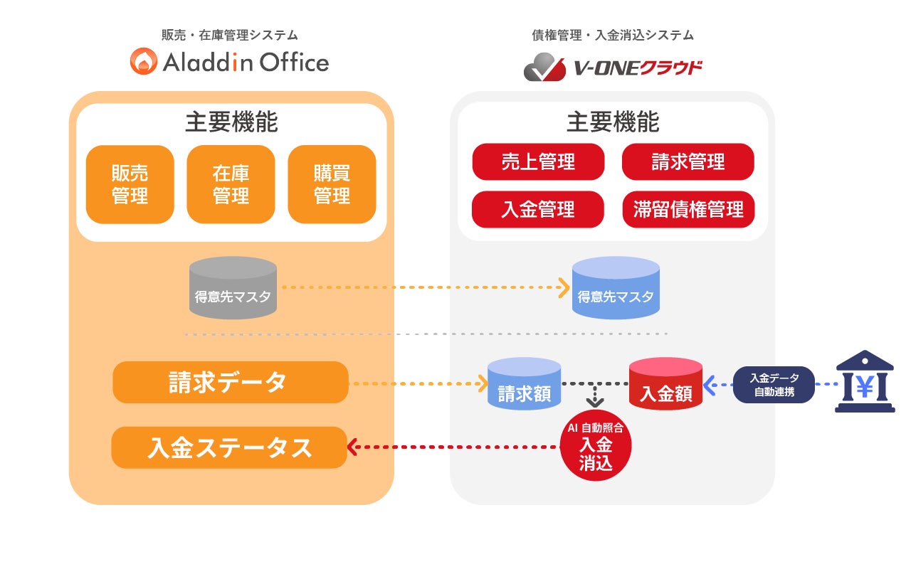 自社開発のITサービスで企業の業務効率化や経営力強化を支援する株式会社アイル(本社:大阪市北区・東京都港区、代表取締役社長:岩本哲夫、以下アイル)が提供する、販売・在庫管理システム「アラジンオフィス」は、株式会社アール・アンド・エー・シー(本社:東京都中央区、代表取締役:高山知泰、以下R&AC)が提供する、債権管理・入金消込システム「V-ONEクラウド」と連携しました。