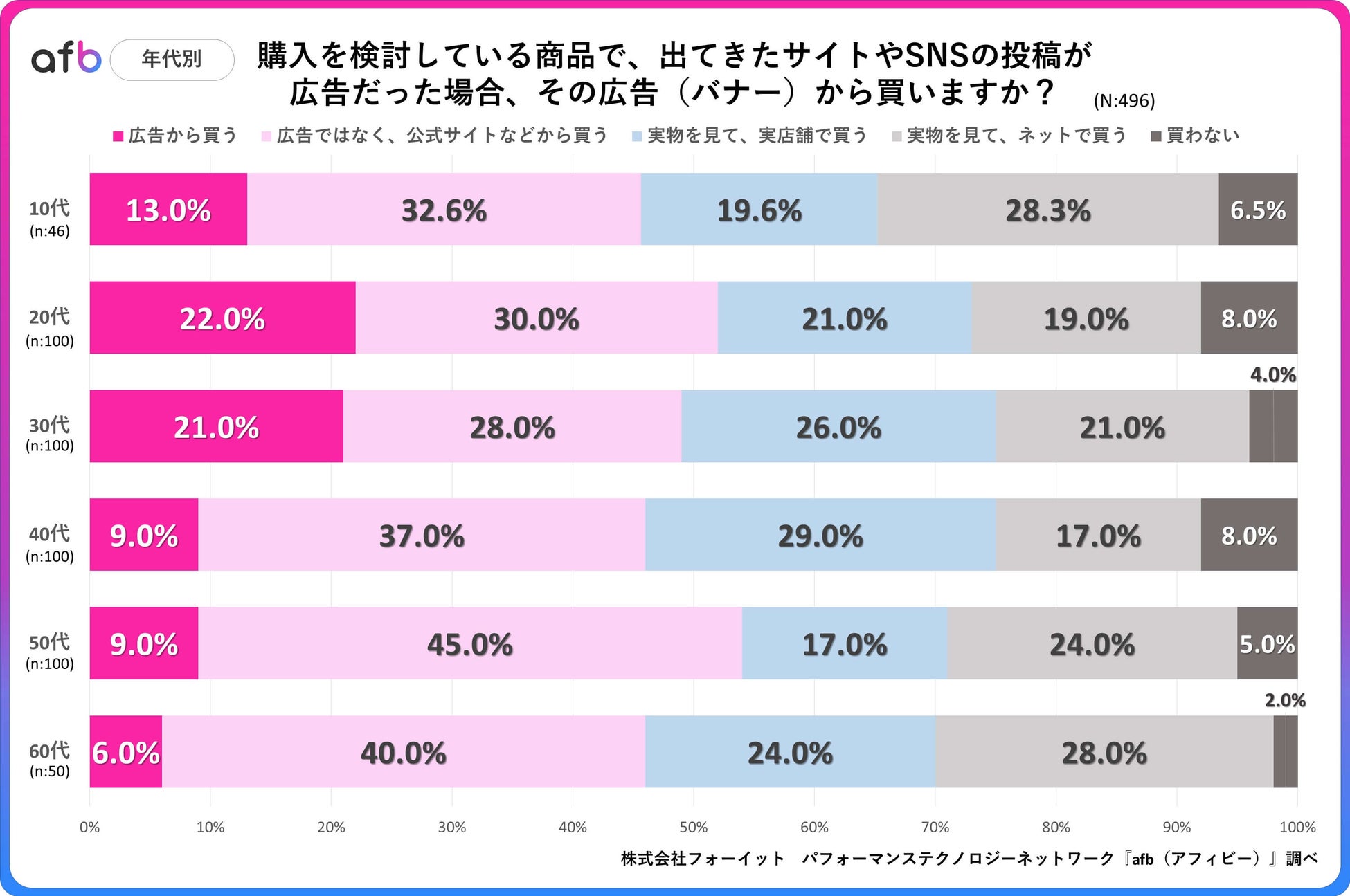 パフォーマンステクノロジーネットワーク「afb(アフィビー)」< https://www.afi-b.com/ >の開発運用をおこなう株式会社フォーイットは、全国の10代~60代までの男女500人を対象に広告に関するアンケートを実施し、年代別・男女別等の特徴についてまとめました。