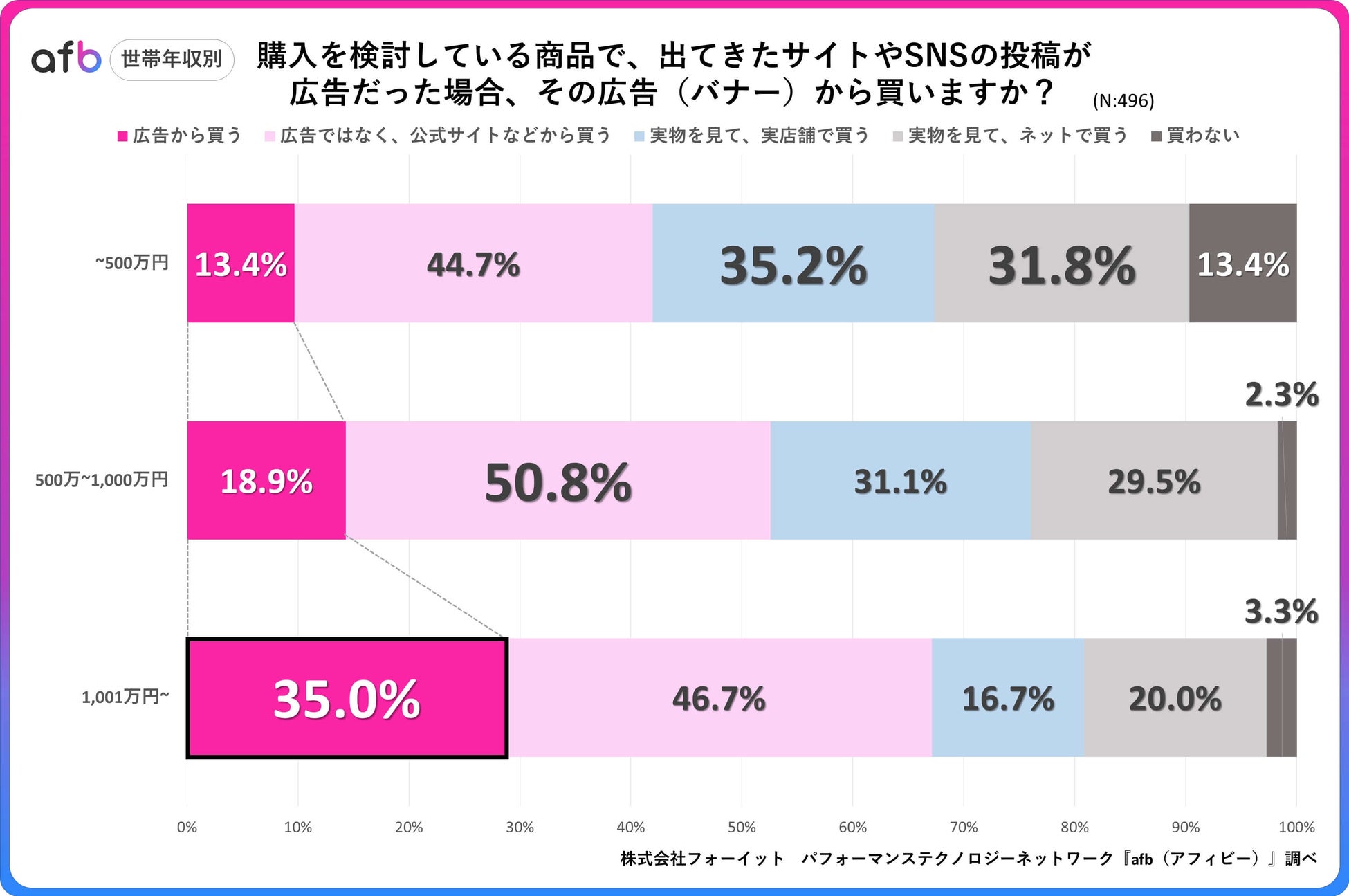 世帯年収別に見ると、「広告から買う」と回答した方は「~500万円」では13.4%だったのに対して、「501万円~1,000万円」では18.9%、「1,001万円~」では35.0%と年収の増加と比例して増えていくことが分かりました。