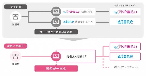 従来、当社の各種後払い決済サービスは、サービス単位でのシステム開発が必須となっていましたが、「後払い共通IF」により、「NP後払い」「atone」について一度の開発で両サービスとの接続が可能となります。