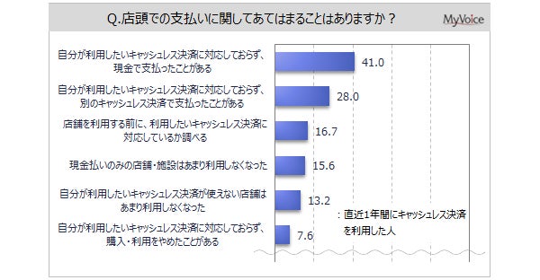 直近1年間にキャッシュレス決済をした人に、店頭での支払いに関してあてはまることを選んでもらいました(複数回答)。