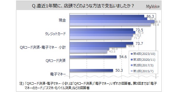 直近1年間に店頭で利用した支払い方法は(複数回答)、「現金」が86.3%で2017年以降減少しています。「クレジットカード」が73.5%です。「QRコード決済」「電子マネー」のいずれかを利用した人は7割強となっています。