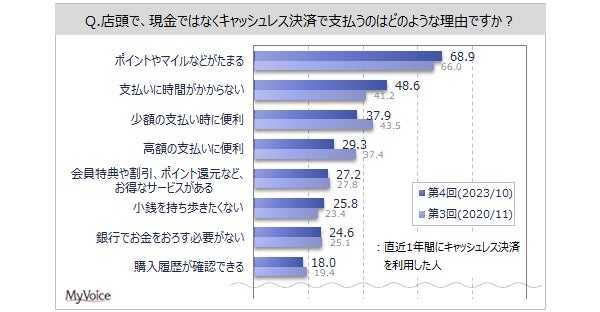直近1年間に店頭でキャッシュレス決済をした人の理由は(複数回答)、「ポイントやマイルなどがたまる」が68.9%、「支払いに時間がかからない」が48.6%、「少額の支払い時に便利」が37.9%、「高額の支払いに便利」「会員特典や割引、ポイント還元など、お得なサービスがある」が各3割弱となっています。