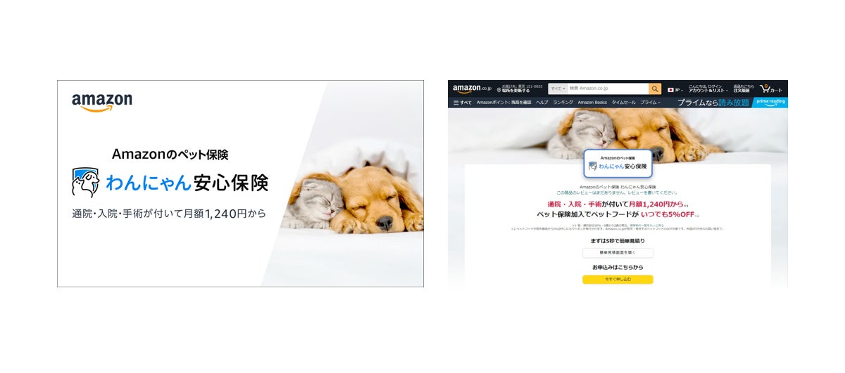 Amazonは、ペット保険「わんにゃん安心保険」( https://www.amazon.co.jp/pet-hoken )を2023年11月1日(水)より募集代理店として販売いたします※1。「わんにゃん安心保険」は、あいおいニッセイ同和損害保険株式会社の子会社であり、当保険の引受保険会社であるリトルファミリー少額短期保険株式会社(以下、リトルファミリー少短)がAmazon.co.jp限定商品としてAmazonと共同開発した、業界最高クラス※2の手厚い補償がありながら生涯保険料において業界最安クラス※3のペット保険です。Amazonが保険募集代理店として日本で保険商品の開発に関わり、また販売するのは今回が初となります。