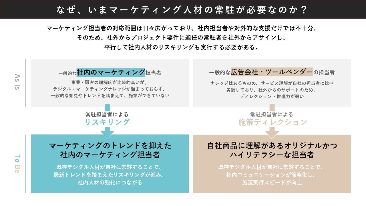 近年、生活者を取り巻くメディア環境や購買行動の急速な変化に伴い、企業は顧客や社会のニーズを汲み取りながら、トレンドのキャッチアップや最新のデジタル技術を駆使して施策を高速かつ精緻に推進することが求められています。その一方で、慢性的なデジタルマーケティング人材の不足や自社内のスキル・知識不足、施策の推進力の弱さに課題を抱える企業も少なくありません。外注する場合であっても、管理やコミュニケーションコストがかかることや市場や顧客理解が正確にできず期待した成果が得られないといった問題も顕在化しています。