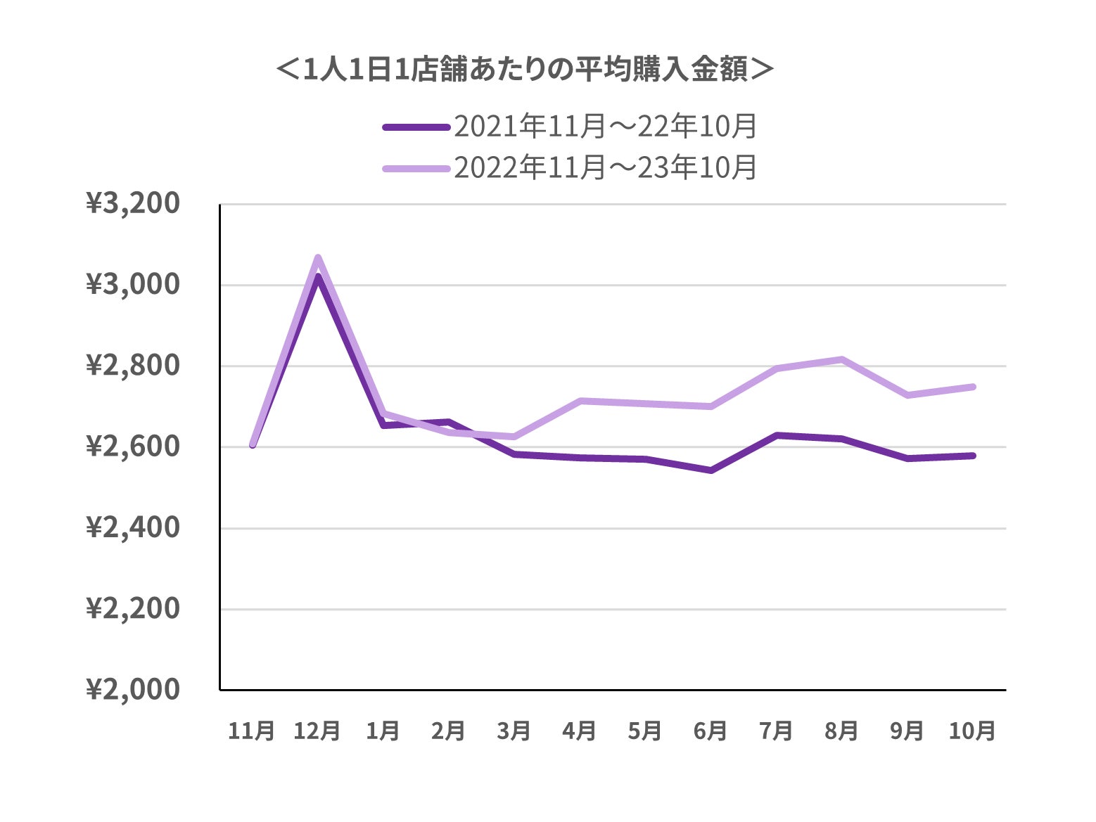 2023年10月のデータを調査した結果、平均購入金額は前年同月比約6.6%(170円)増、前月比約0.8%(21円)増加しています。
