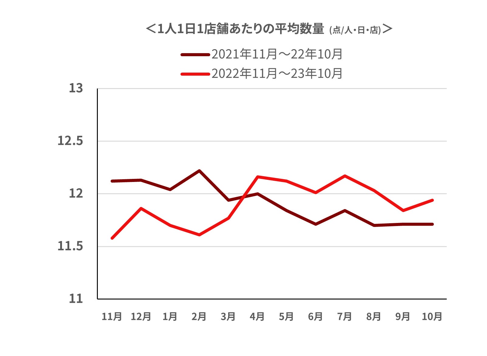 平均購入金額を構成するそれぞれの要素を見てみると、10月の平均単価は前年同月比約4.6%(約10.1円)増、前月比約0.1%(約0.2円)減、平均購入数量は前年同月比約2.0%(約0.2点) 増、前月比約0.8%(約0.1点) 増加しています。