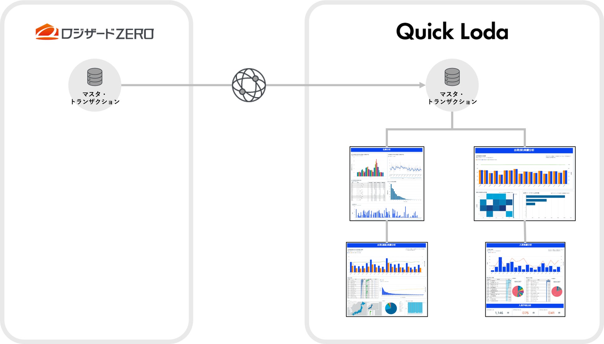 「ロジザードZERO」が保持している、各種マスタ・入出荷情報・在庫情報を「Quick Loda」が自動的に取得、入荷・出荷・在庫状況をダッシュボード化し、いち早く分析に役立てることができます。