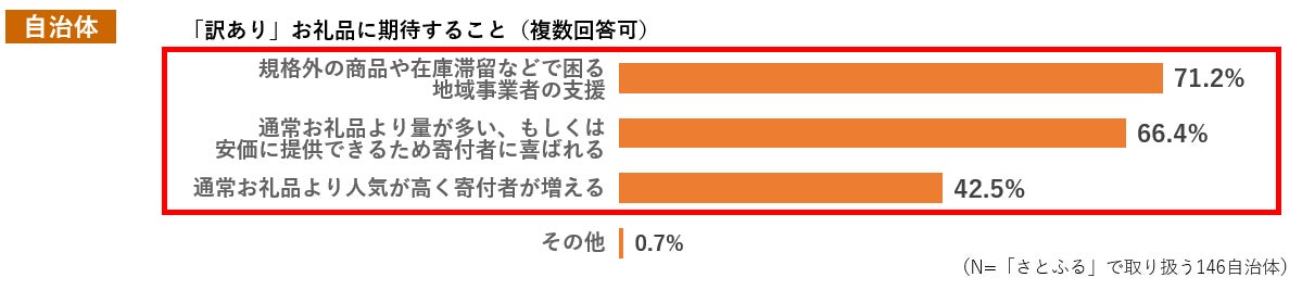 ・「訳あり」お礼品に期待することとして、「規格外の商品や在庫滞留などで困る地域事業者の支援(71.2%)」が最も多く、「寄付者に喜ばれる(66.4%)」「通常お礼品より人気が高く寄付者が増える(42.5%)」が続きました。