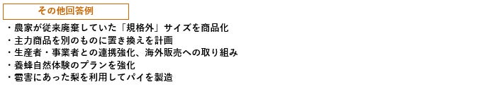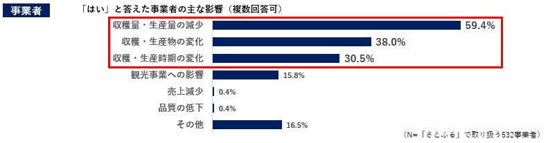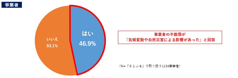 ・事業者の46.9%が今年の猛暑など、気候変動や自然災害による影響があったと回答しました。具体的な影響として「収穫量・生産量の減少」が59.4%、「(傷物が増えたなど)収穫・生産物の変化」が38.0%と続きました。対策として「廃棄していた規格外サイズの品を商品化」「主力商品の置き換え」「海外販売への取り組み」などが挙げられました。