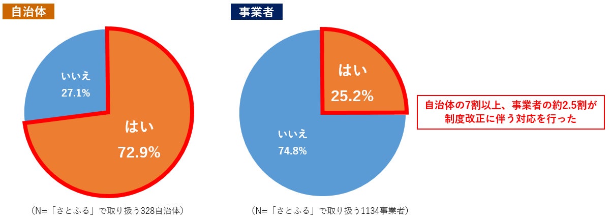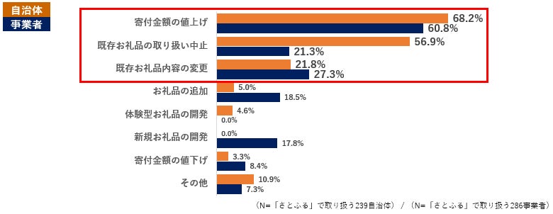 ・自治体の72.9%が制度改正に伴う対応を行ったことに対し、事業者は25.2%にとどまりました。対応の内容としては「寄付金額の値上げ(自治体68.2%、事業者60.8%)」が最も多く、「既存お礼品の取り扱い中止」「既存お礼品内容の変更」が続いた一方で、「お礼品の追加」や「体験型お礼品の開発」などに取り組む自治体も見られました。