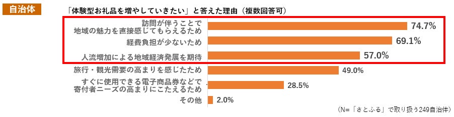 ・体験型お礼品の需要について57.0%の自治体が「高まりを感じる」と答え、さらに全体の75.9%の自治体が「体験型お礼品を増やしていきたい」と回答していることから、今後も増えていくことが予測されます。「増やしていきたい」理由としては、「訪問が伴うことで地域の魅力を直接感じてもらえるため(74.7%)」「(配送料などの)経費負担が少ないため(69.1%)」などが挙げられました。