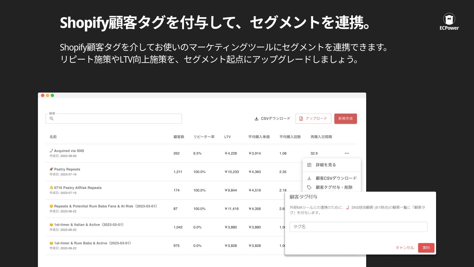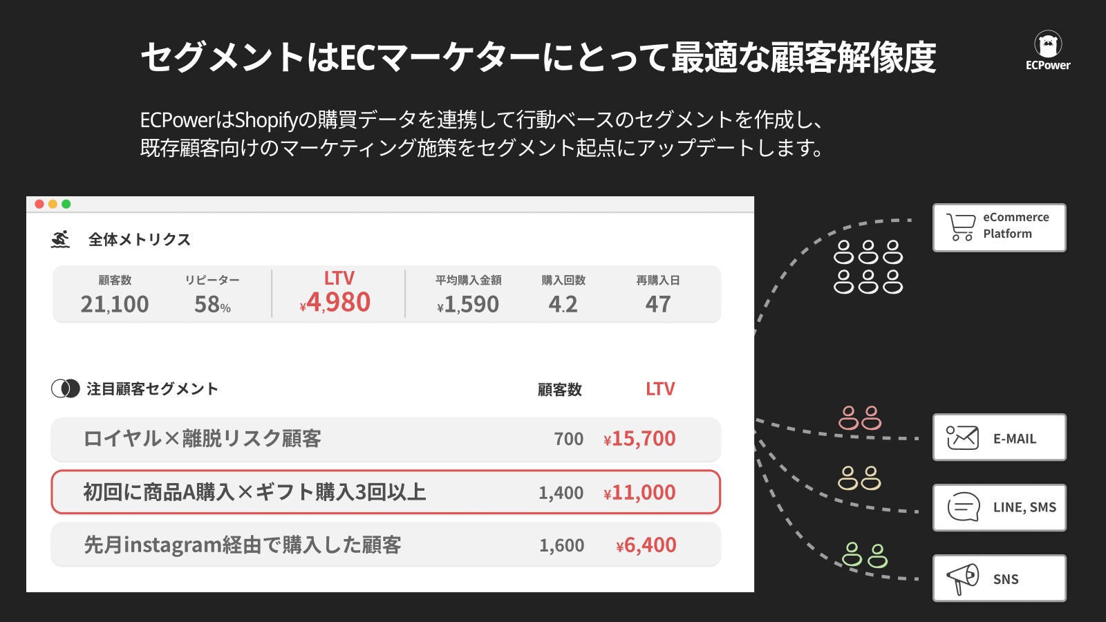 株式会社ECPower (本社:東京都港区、代表:増田大夢)は、本日11月13日に、ECの既存顧客をニーズや行動ベースのセグメントで管理するノーコードツール『顧客セグメントツール ECPower』を、Shopifyアプリストアでリリースしました。