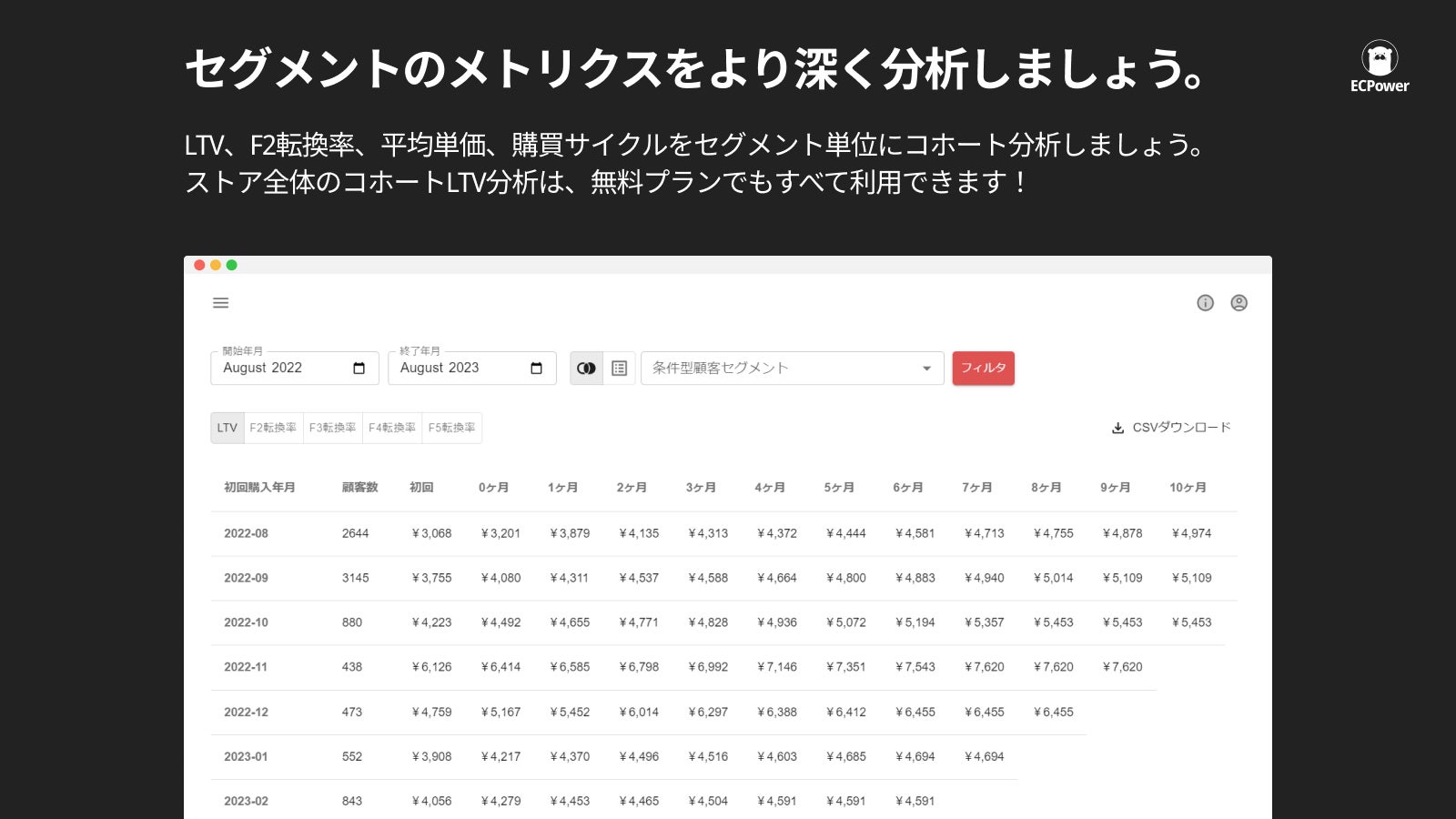 コホートLTV表やF2転換率表などの、作成に労力のかかる分析表がワンクリックで表示できます。もちろん、セグメント単位でのデータ表示も簡単です。すべてのデータはCSV形式でダウンロードできるので、手元でさらに細かい分析を行うことが可能です。