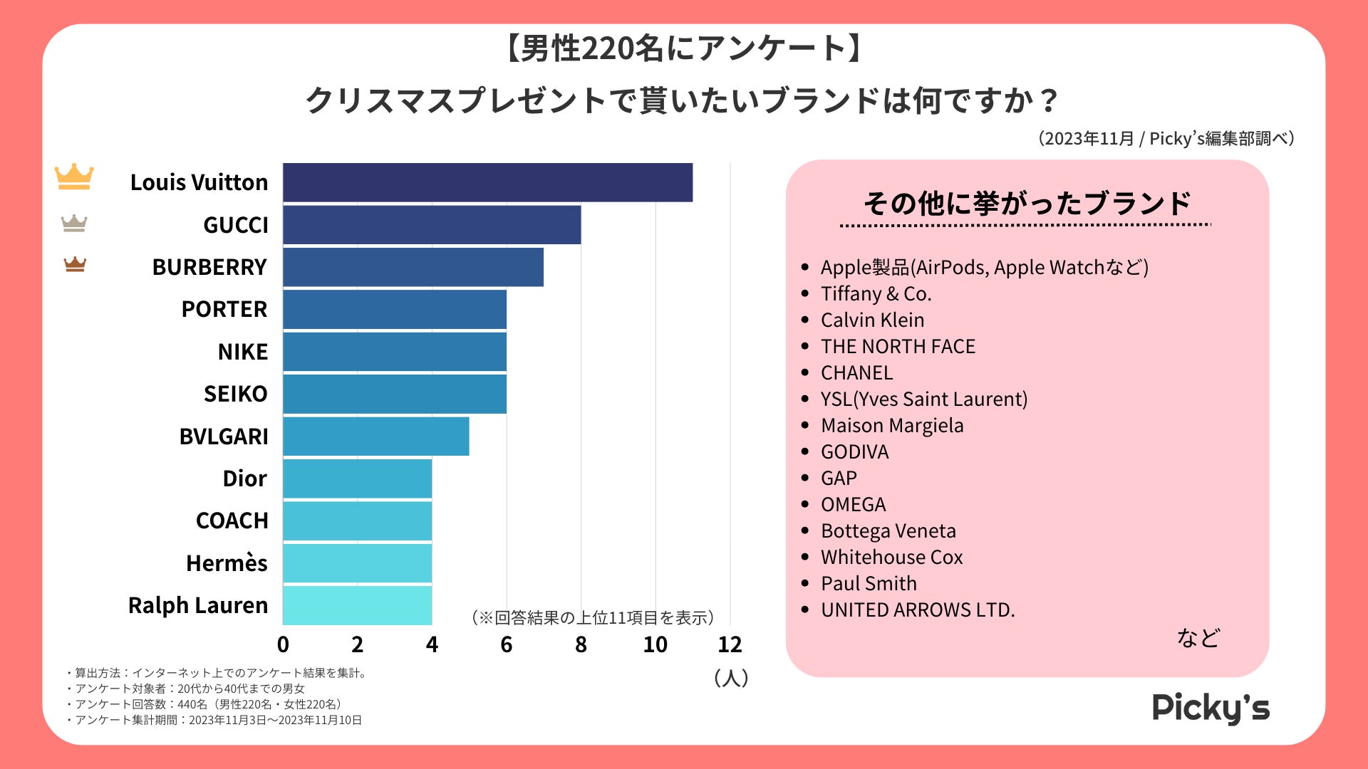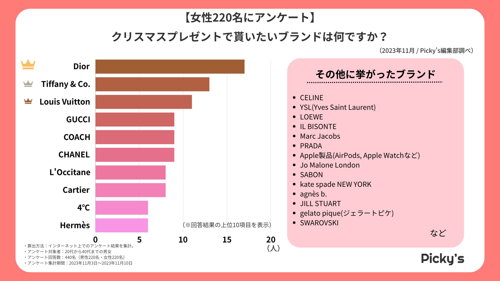 一方で女性の場合は、「Dior」「Tiffany & Co.」「Louis Vuitton」の順で多くの回答をいただきました。