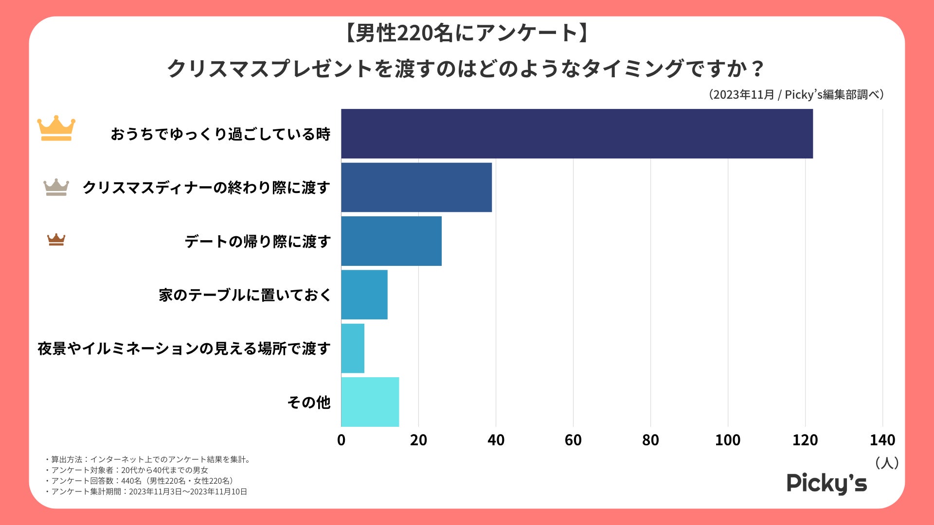 ちなみに「その他」を選択された方にどのようなタイミングでクリスマスプレゼントを渡すか回答してもらったところ、「出会ったタイミングで渡す」(九州・沖縄地方在住 20代男性)というタイミングの他、「一緒に買いに行く」(関東地方在住 40代男性)といったように敢えて渡すタイミングを考えず、一緒にプレゼントを買いに行きそこで渡すという方もいらっしゃいました。