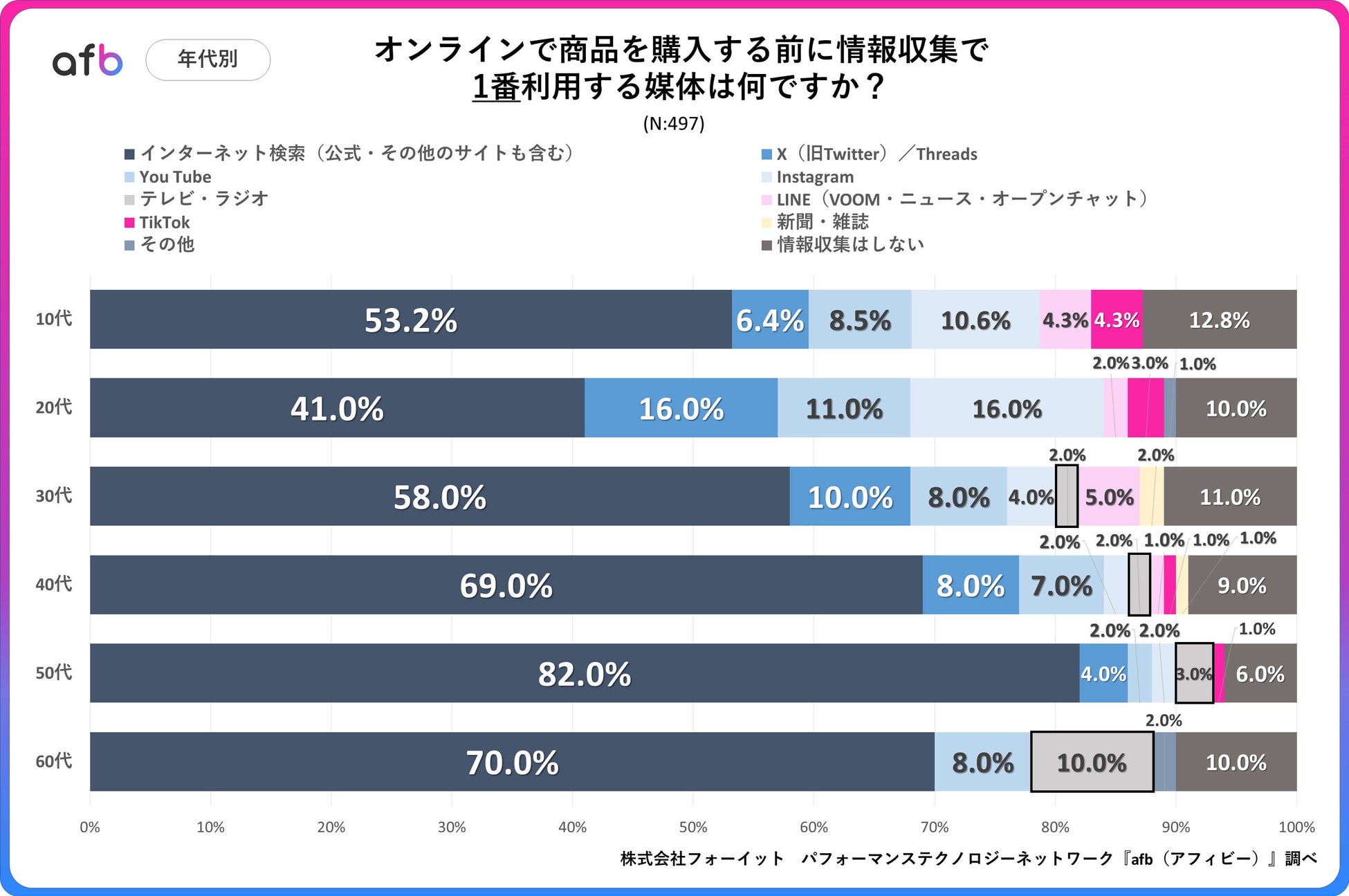 パフォーマンステクノロジーネットワーク「afb(アフィビー)」< https://www.afi-b.com/ >の開発運用をおこなう株式会社フォーイットは、全国の10代~60代までの男女500人を対象に情報収集に関するアンケートを実施し、年代別・男女別等の特徴についてまとめました。