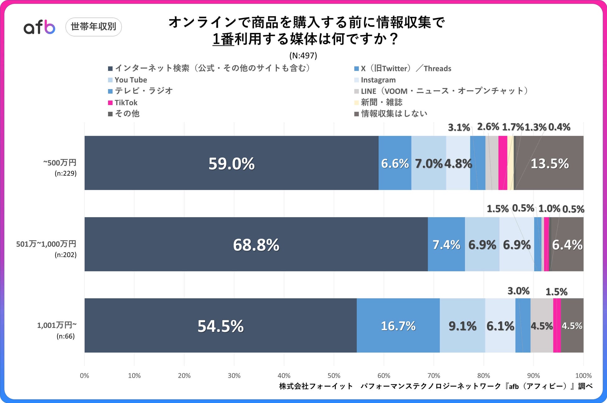項目毎の詳細を見ると、世帯年収501万~1,000万円の層では68.8%が「インターネット検索(公式・その他のサイトも含む)」と回答しているのに対して、1,001万円~の層では54.5%にとどまっており、SNSやYou Tubeで情報集をしている方の比率が高いことが分かりました。購入する商品・サービスの種類や価格帯に合わせて、リサーチする媒体を選択しているということなのかもしれません。