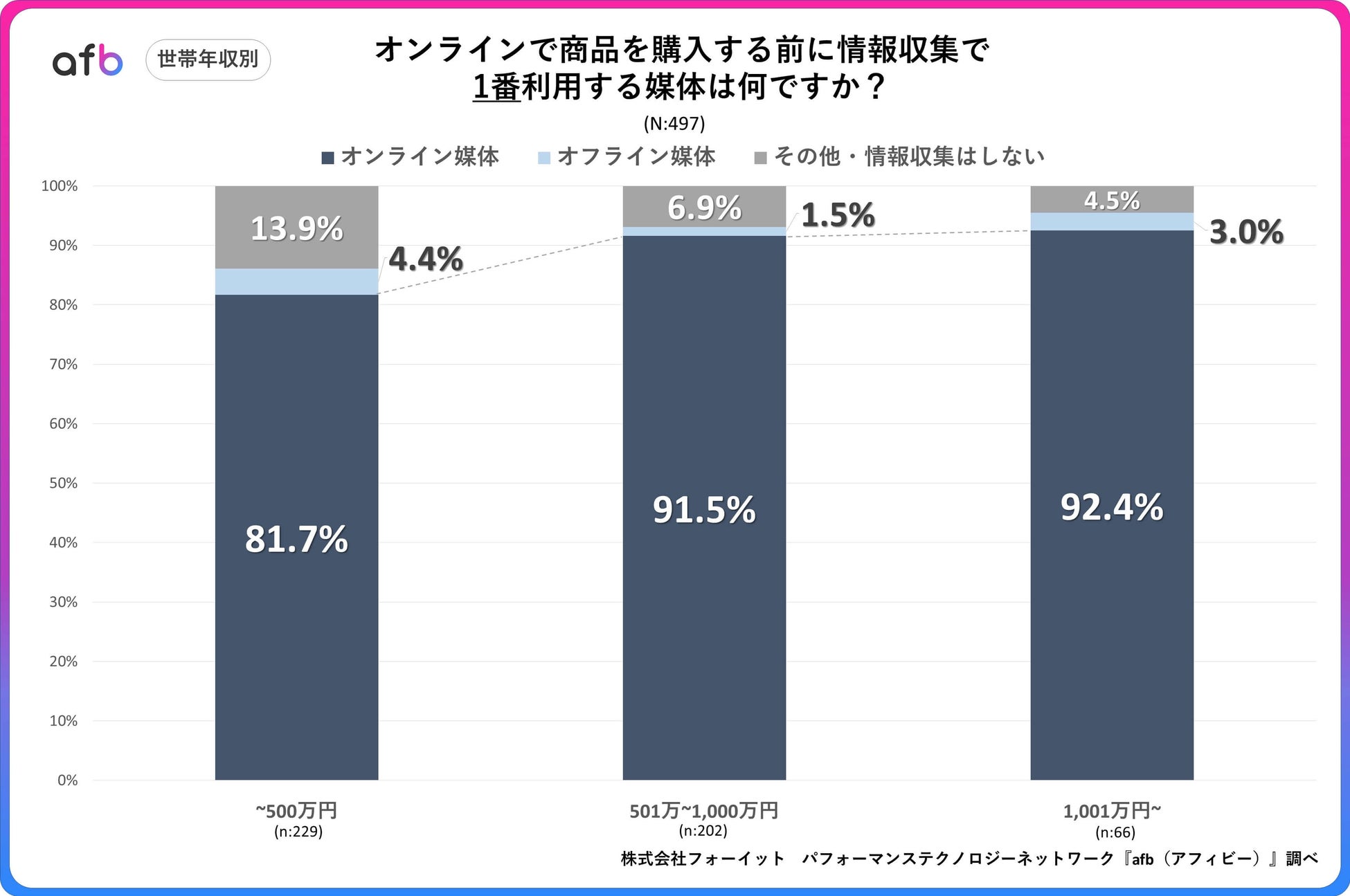 世帯年収別で見ると、オンラインで商品を購入する前にオンライン媒体で情報収集を行っている方は、世帯年収が高くなるにつれて増えていることが分かりました。総務省が発表している「令和5年 情報通信に関する現状報告の概要」によると、世帯年収の増加に比例してインターネットの利用率も高くなることが明らかになっています。前提として、インターネットの利用率に差があることから今回の調査のような差が生まれたと考えられます。