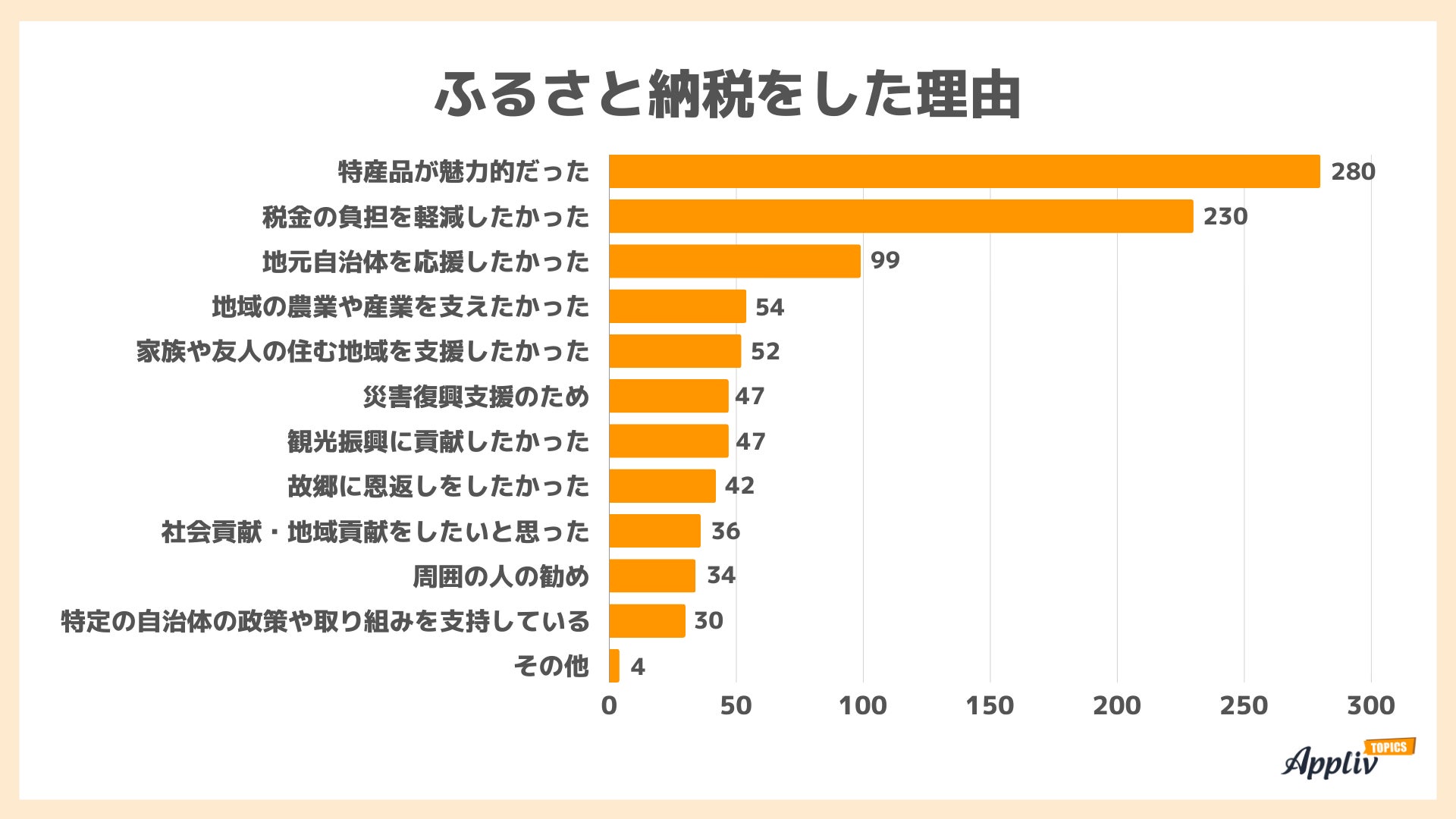 ふるさと納税を「利用した」と回答した427人に、ふるさと納税をした理由(複数回答可)を尋ねました。最多は「特産品が魅力的だった」で280人。次いで「税金の負担を軽減したかった」が230人でした。