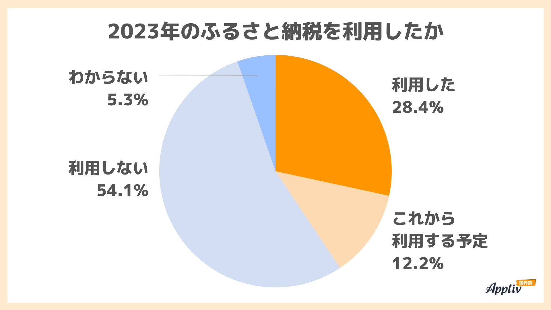 - 2023年のふるさと納税を「利用した」28.4%、「これから利用する予定」12.2%。