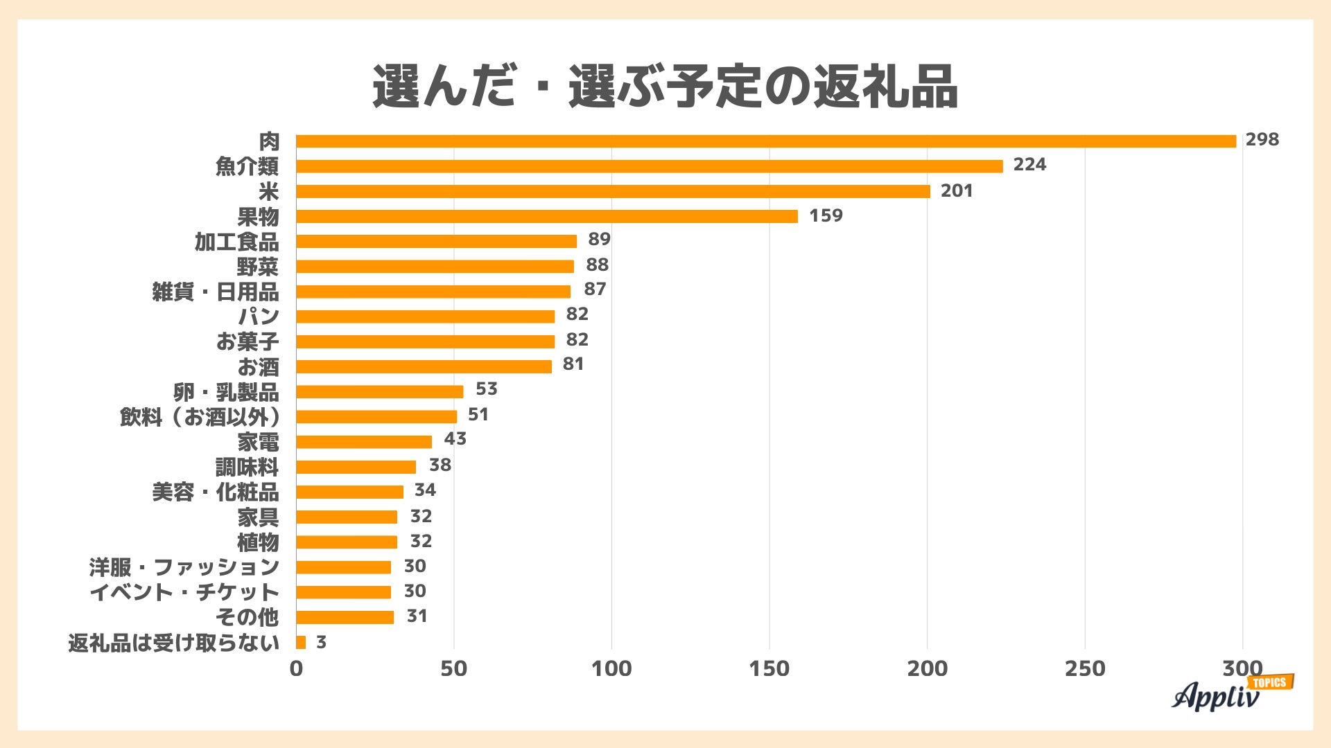 最多は「肉」で298人。次いで「魚介類」224人、「米」201人、「果物」159人でした。食料品に人気が集中しています。