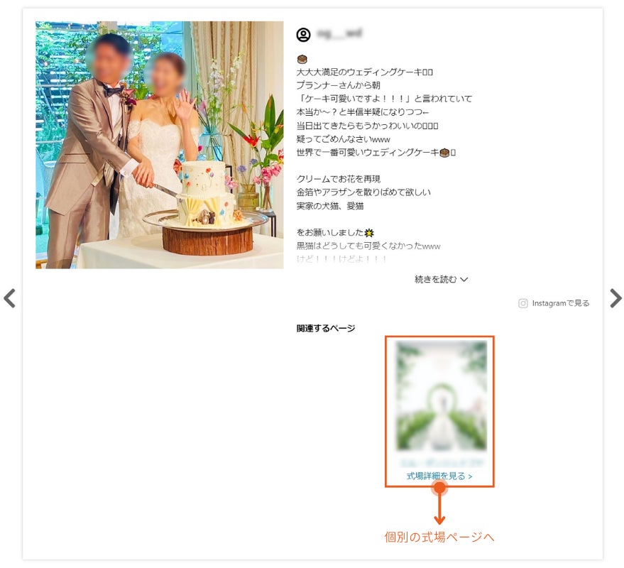 これまでもハナユメサイト上には、自社で収集したクチコミが掲載されていましたが、Letroを活用してInstagram投稿を掲載することで実際の結婚式の様子をよりリアルで多様なビジュアルを通じて伝えることができるようになりました。また、掲載するInstagram投稿には、「関連するページ」を設定し、個別の式場のページへ誘導しています。