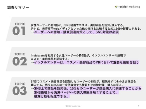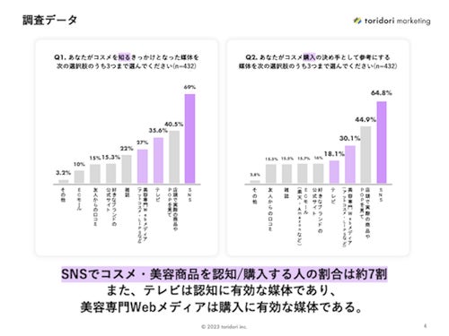 スマートフォンの普及前は、テレビCMや雑誌広告で商品のプロモーションを行うことが一般的でした。しかし、スマートフォンの普及により、商品宣伝の新たな媒体としてSNSが脚光を浴びております。特に、コスメ・美容商品は、トレンドに敏感なユーザーに対して、毎シーズン新商品の認知と購入施策を打ち続ける必要があります。即時性が高く、トレンド発信と親和性が高いSNS施策は、コスメ・美容商品のPRには無くてはならない存在と言えるのではないでしょうか。toridoriのSNSに関する調査レポートの第九弾となる今回は、全国432名の15〜59歳の女性を対象に調査を実施し、コスメ・美容商品とSNSに関する購買実態の詳細が明らかになりました。