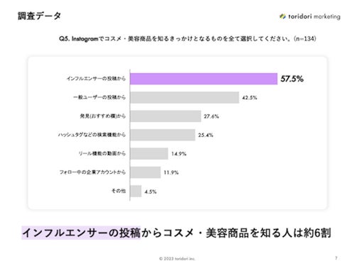 インフルエンサーがそれぞれの個性を生かしたPR投稿は、Instagramを利用する女性ユーザーの約6割にとってコスメ・美容商品の認知のきっかけとなっていることがわかりました。