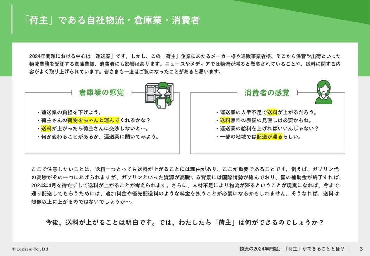 クラウド型在庫管理システムのリーディングカンパニーであるロジザード株式会社(東京都中央区、代表取締役社長:金澤 茂則、以下:ロジザード)は、物流コンサルタント・物流系YouTuber「ロジカイギ」としてご活躍される株式会社LiNKTH(千葉県浦安市、代表取締役:小橋 重信、以下:リンクス)、トランスフィード株式会社(東京都千代田区、代表取締役:長井 隆典、以下:トランスフィード)、株式会社トークロア(東京都武蔵野市、代表取締役社長:伊藤 良、以下:トークロア)監修のもと、『物流の2024年問題、「荷主」ができることとは?』資料を作成、無料公開しましたのでお知らせいたします。