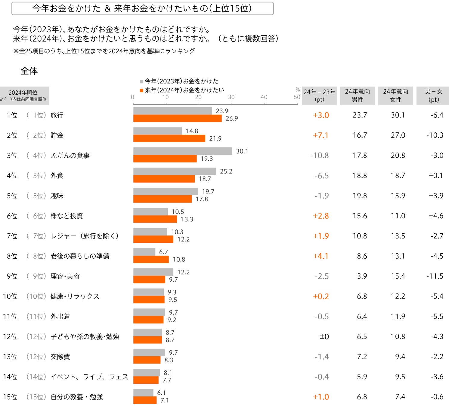 - 「来年お金をかけたいもの(全25項目)」の上位は、「旅行」(26.9%)、「貯金」(21.9%)、「ふだんの食事」(19.3%)。そのうち上位2項目は「今年お金をかけた」を上回っており、その差分は「貯金」で+7.1pt、「旅行」で+3.0ptとなっています。