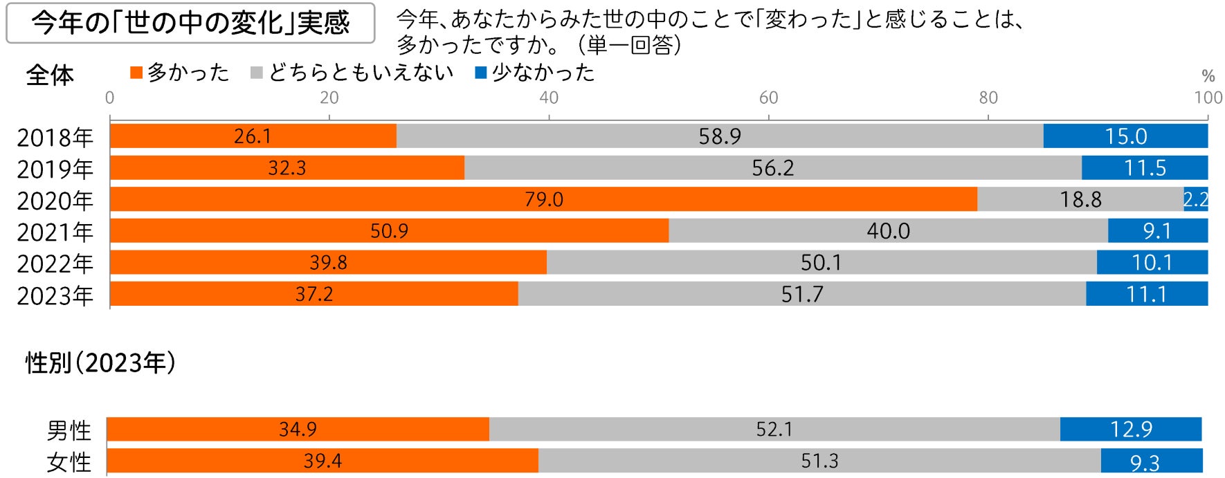 - 今年の「世の中の変化」実感は、「多かった」が37.2%、 「少なかった」が11.1%と、ともに前回から大きな変動はありませんでした。