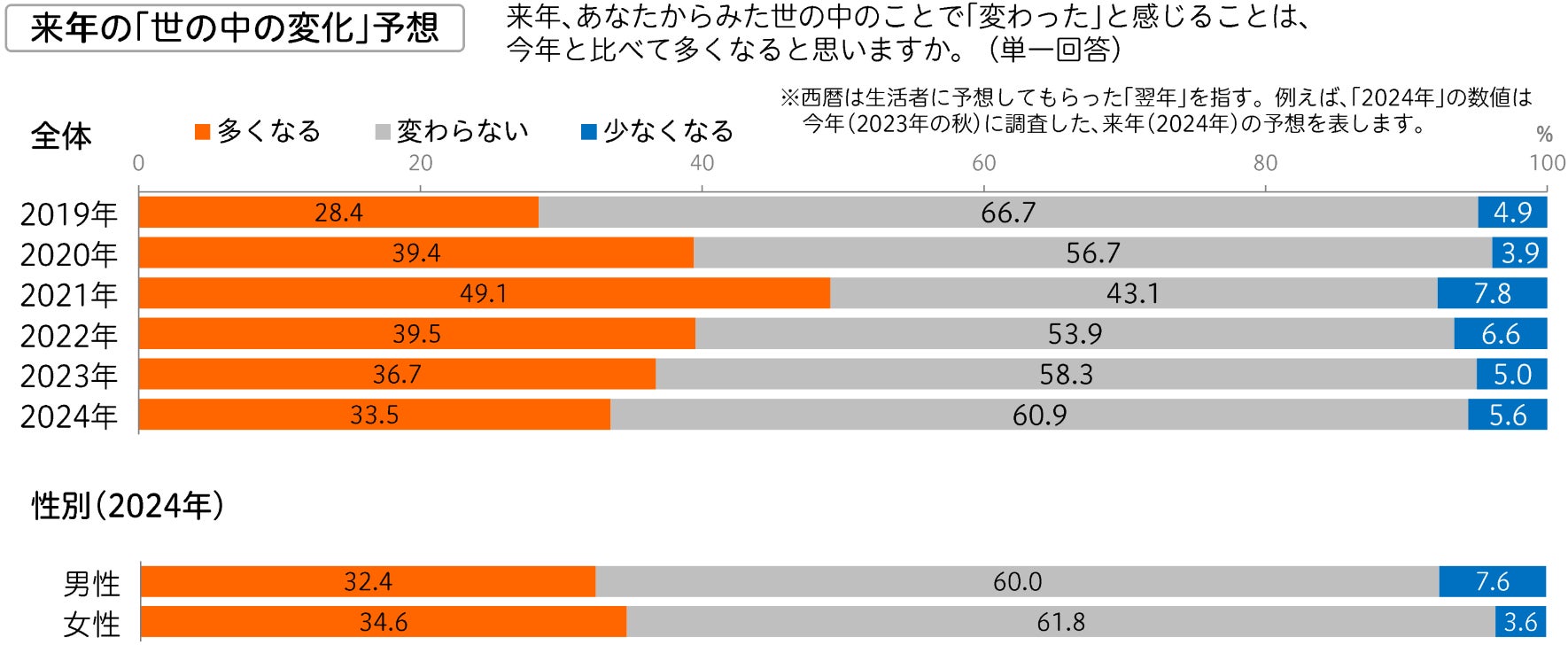 - 来年の「世の中の変化」予想は、「多くなる」が前回から-3.2ptとやや減少して33.5%となり、3年連続での減少となりました。