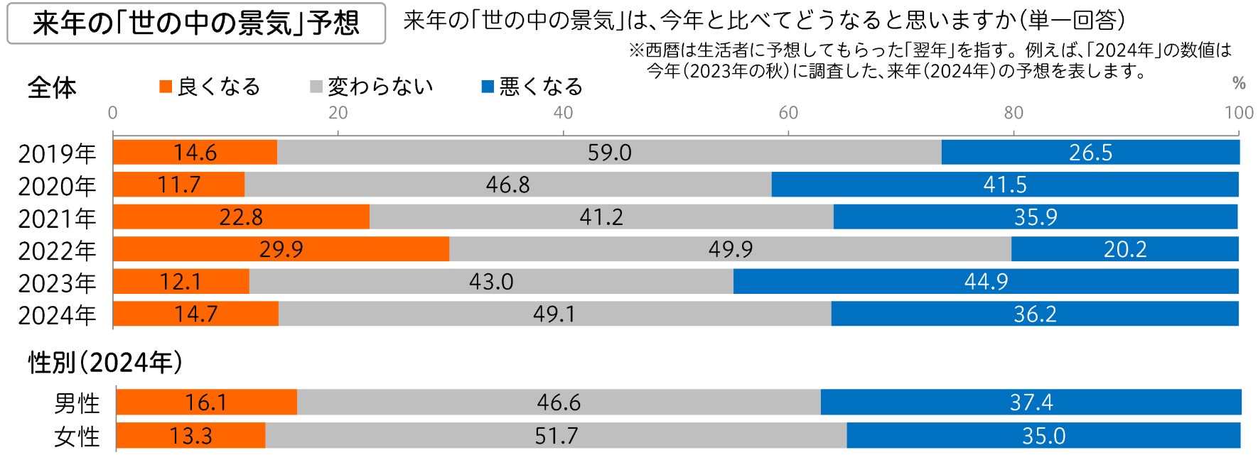 - 来年の「世の中の景気」予想は、「悪くなる」が36.2%で、スコアが大幅に増加した前回 (44.9%)より-8.7ptと減少しました 。一方、「良くなる」(14.7%)は前回(12.1%)より+2.6ptとやや増加しているものの、「悪くなる」の方が2倍以上のスコアとなっています。