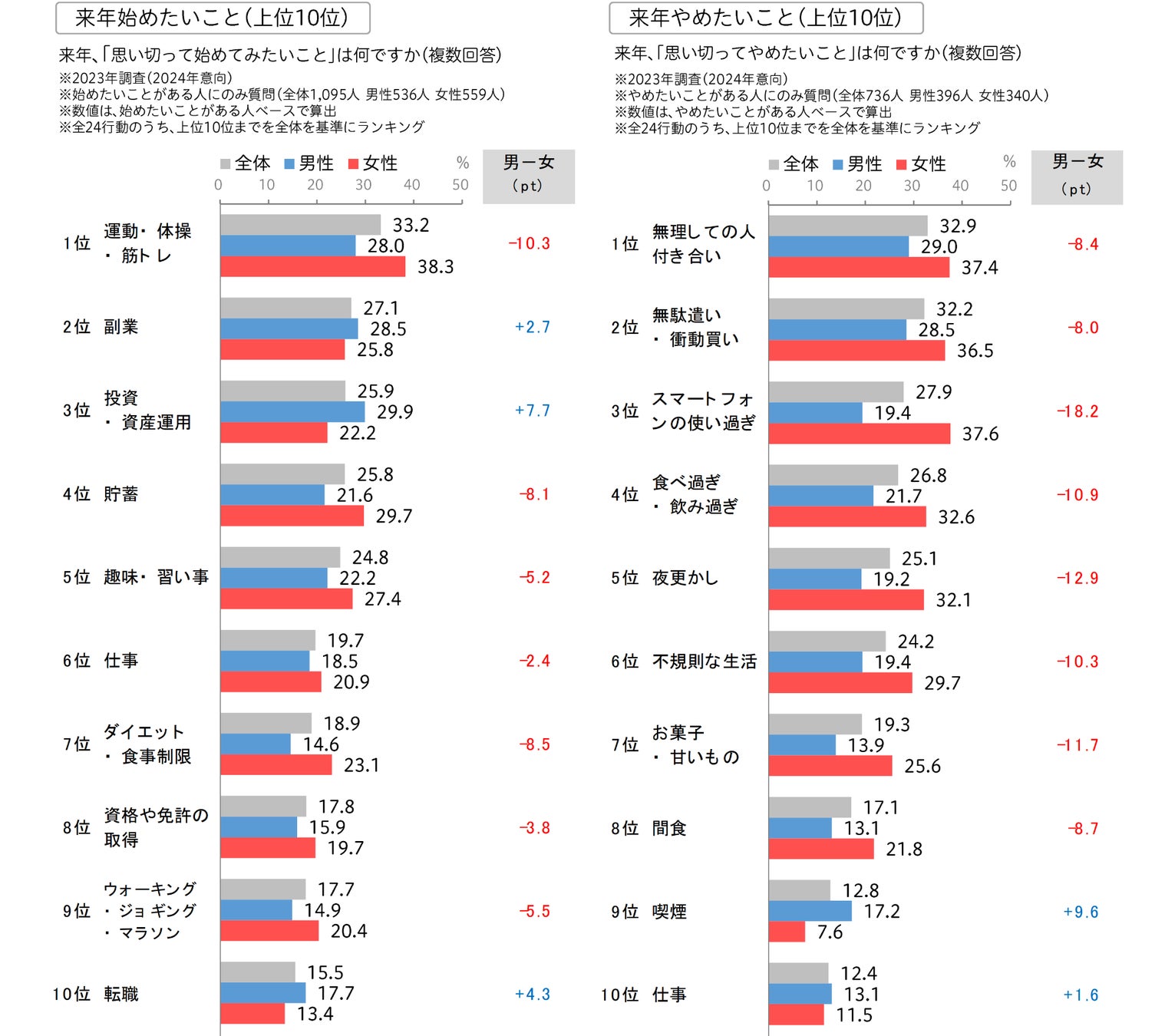 - 一方、「やめたいこと」は「無理しての人付き合い」(32.9%)、「無駄遣い・衝動買い」(32.2%)、「スマートフォンの使いすぎ」(27.9%)が上位に。来年は、体力の向上と合わせて、無理や無駄の抑制・効率化を目指し、収入や蓄えを増やそうという意識がみられます。