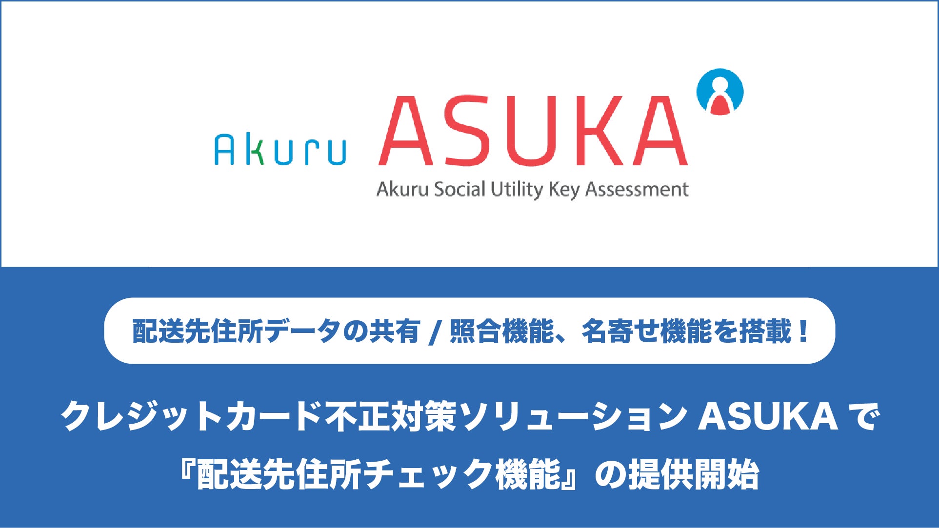 クレジットカードの不正対策ソリューション「ASUKA」を提供する株式会社アクル(所在地:東京都港区、代表取締役社長:近藤 修、以下「当社」)は、主に物販ECを展開するクレジットカード加盟店へ向け、「ASUKA」を通じて商品の配送先住所データを元にカード不正利用を検知する『配送先住所チェック機能』の提供を正式に開始したことをお知らせいたします。