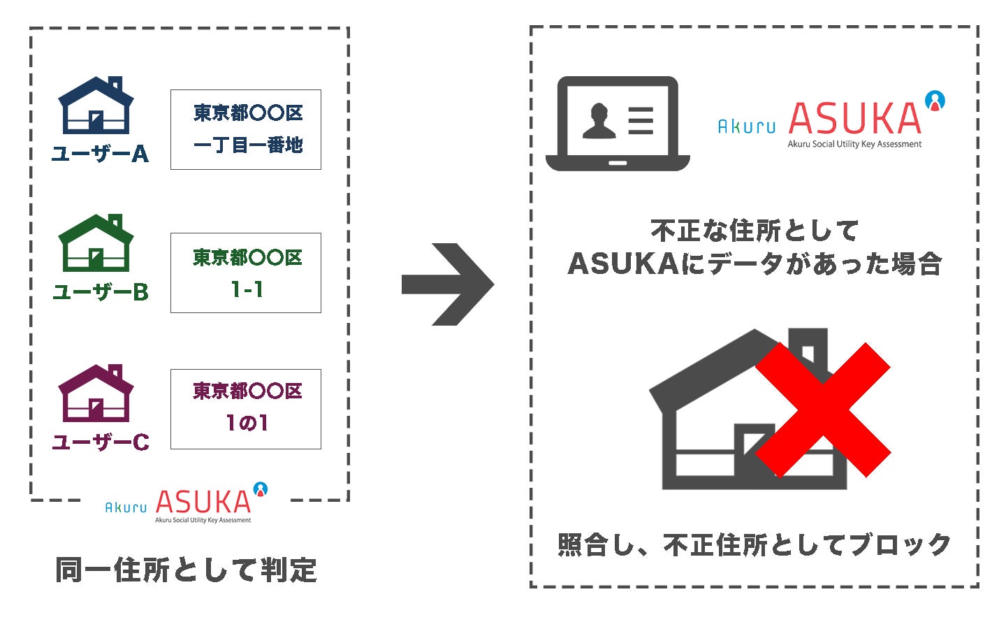 クレジットカードの不正利用が生じた配送先住所データをASUKA内部に蓄積し、これらのデータと照合することにより、ASUKAを利用するECカード加盟店はより強固な不正利用対策を実現することが可能になります。