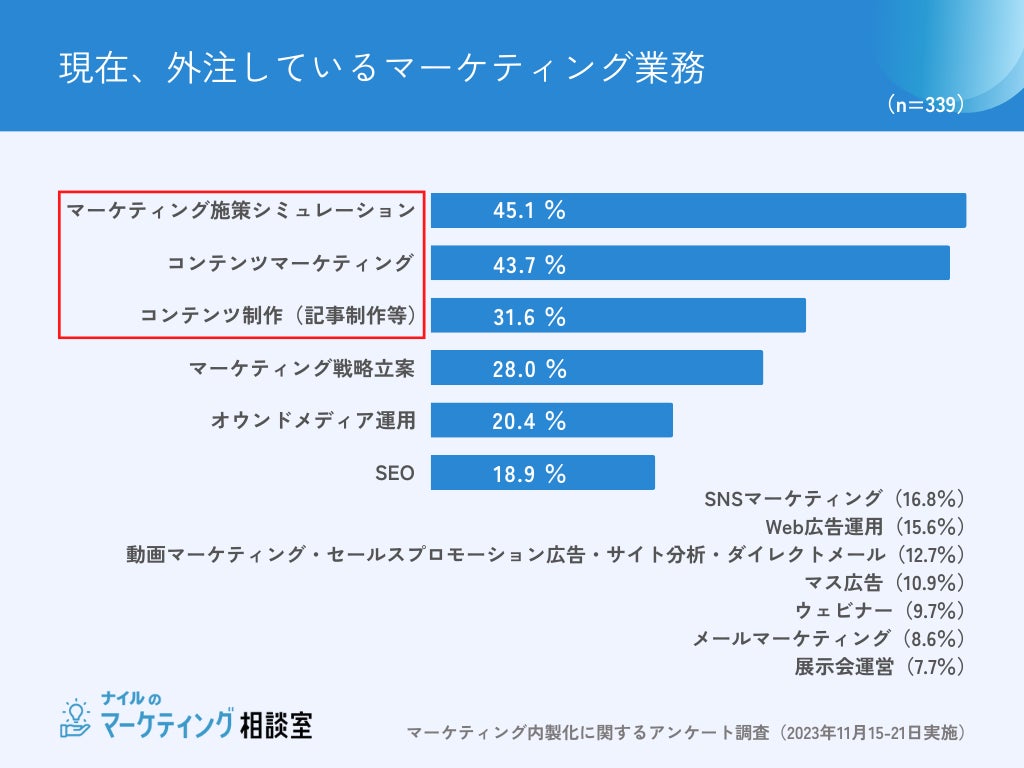 現在、マーケティング業務において、外部ベンダー・業務委託等を利用していると回答した339名に、外注している業務を聞きました。1位は「マーケティング施策のシミュレーション作成(45.1%)」2位「コンテンツマーケティング(43.7%)」3位「コンテンツ制作(31.6%)」でした。