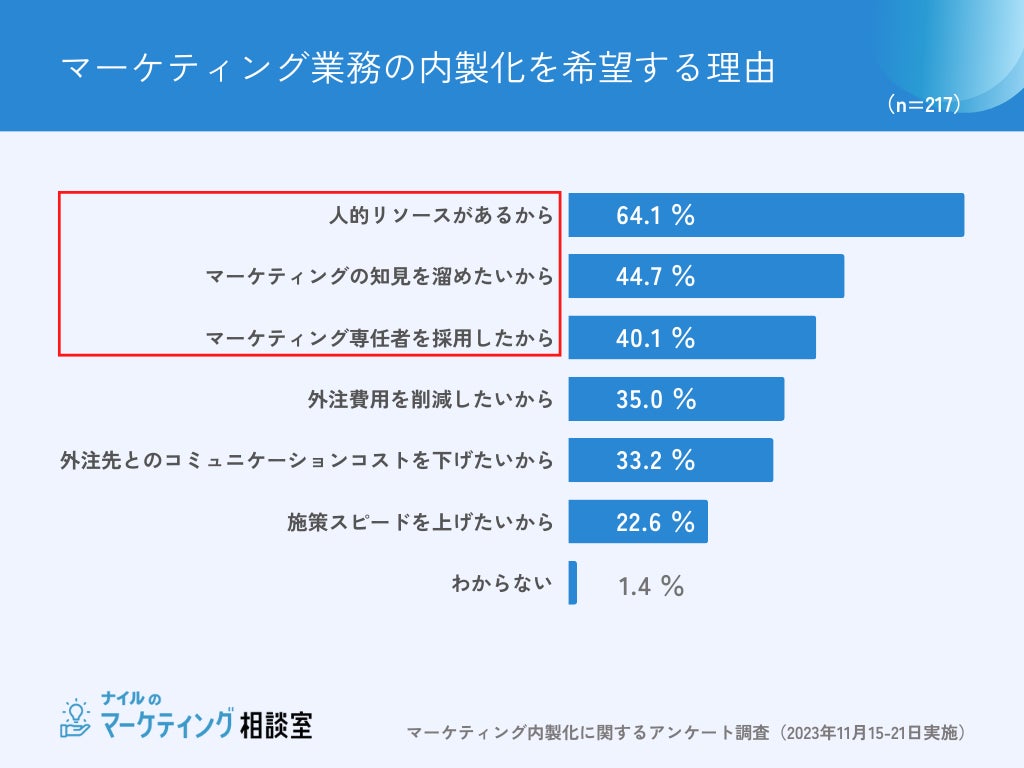 マーケティング業務の内製化をしたいと回答した217名に理由を聞いたところ、最も多い回答は「社内に人的リソースがあるから(64.1%)」でした。次いで「マーケティングの知見を溜めたいから(44.7%)」「マーケティング専任者を採用したから(40.1%)」「外注費用を削減したいから(35%)」と回答しました。