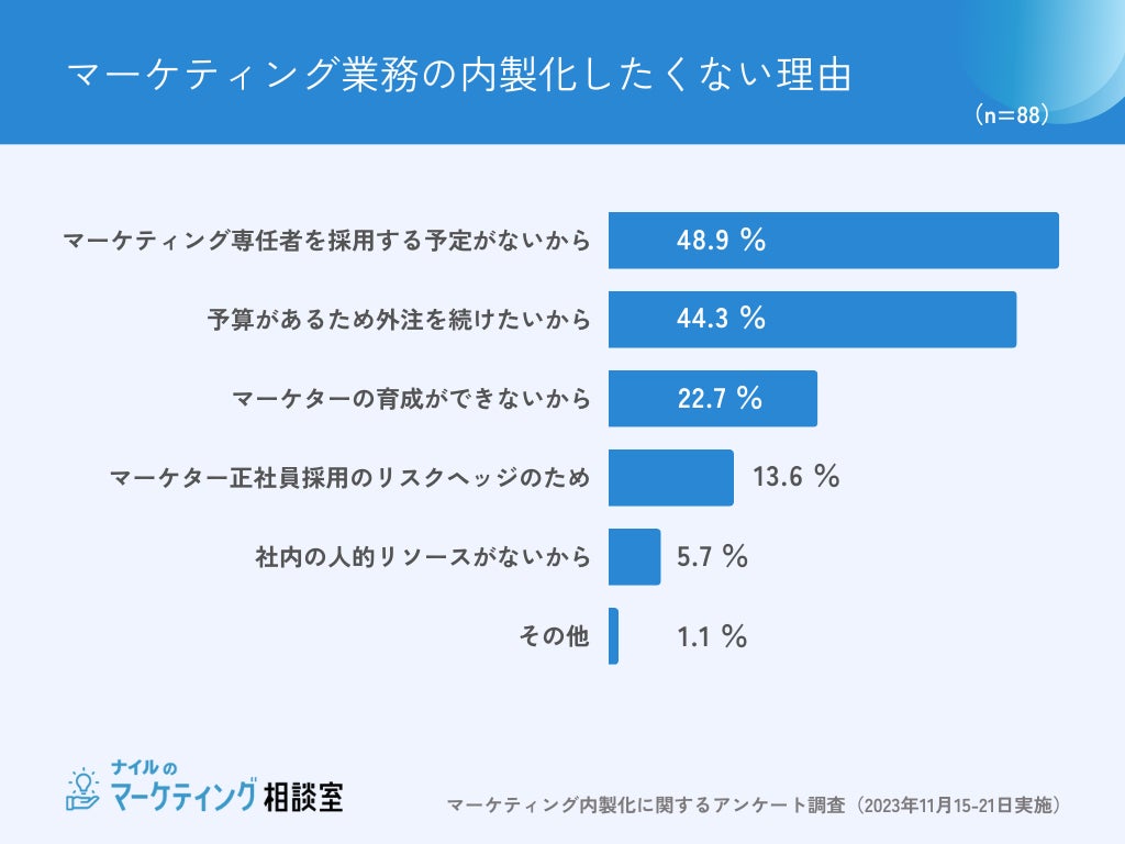 マーケティング業務の内製化をしたくないと回答した88名に、理由を聞いたところ1位は「マーケティング専任者を採用する予定がないから(48.9%)」でした。次いで「予算があるため外注を続けたいから(44.3%)」「マーケターの育成ができないから(22.7%)」と回答しました。